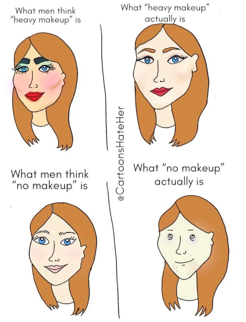 Men point out all the time that they prefer women who wear little to no make-up, and are often met with responses from women that a) they don’t care, they wear make-up for themselves, not for dudes, and it’s a form of “self-care”, or b) actually, men are just kind of stupid and don’t realize the “make-up-free” women they are drooling over are actually wearing make-up.