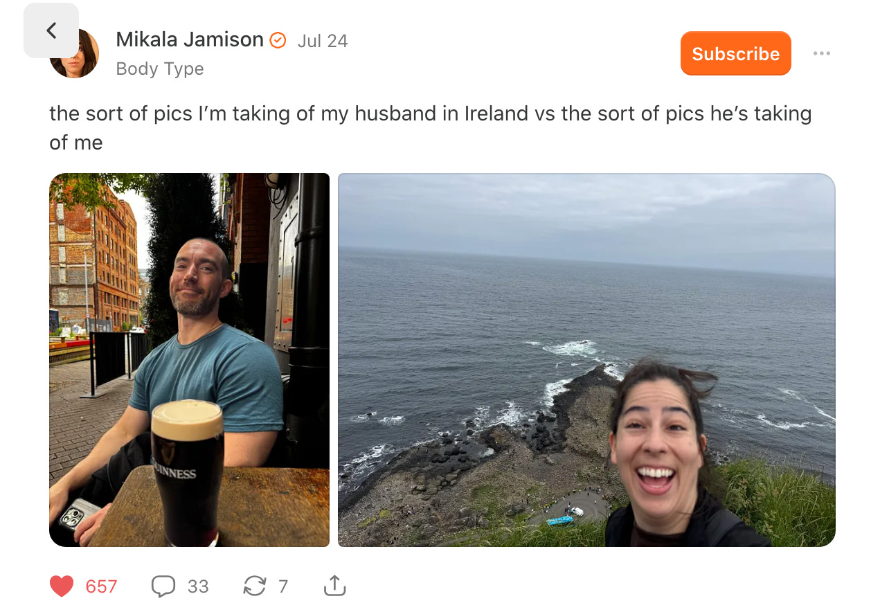 Just today, while I was writing this, Cartoons Hate Her dropped a funny and relatable essay calling herself a “mid” in part because she has too-short legs and I’m guessing a similar nose to mine — ouch! The thing is, I doubt she’s “mid”. She’s probably gorgeous (her husband later confirmed in the Subscriber Chat that she is indeed a total hottie).